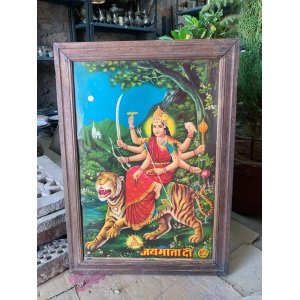 1970’s Old Rare Vintage Hindu Religious Goddess Durga Lithograph Print Framed