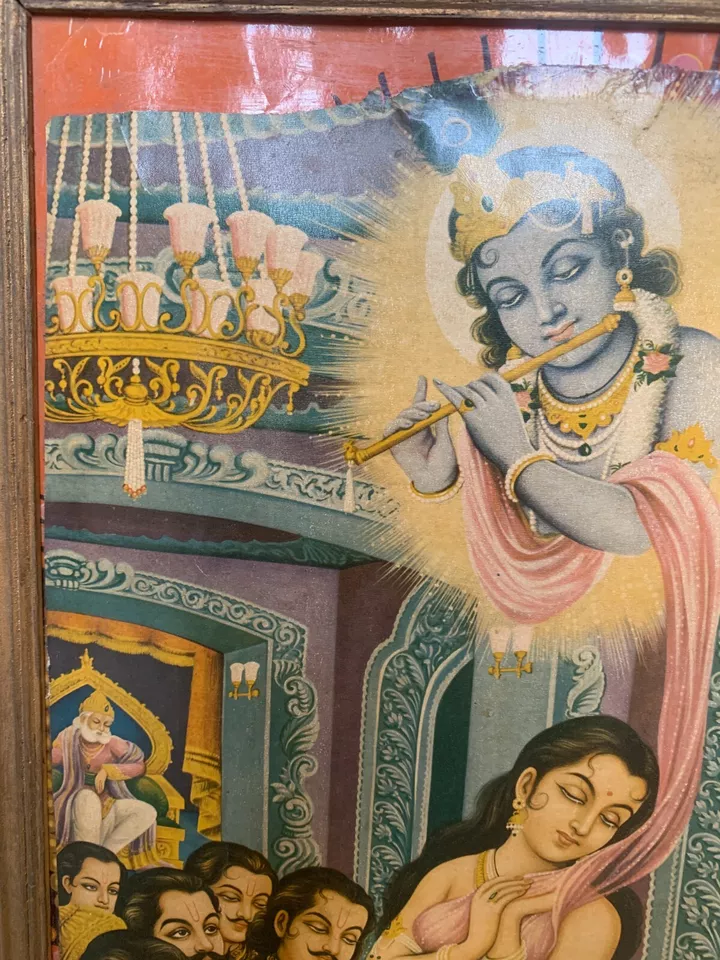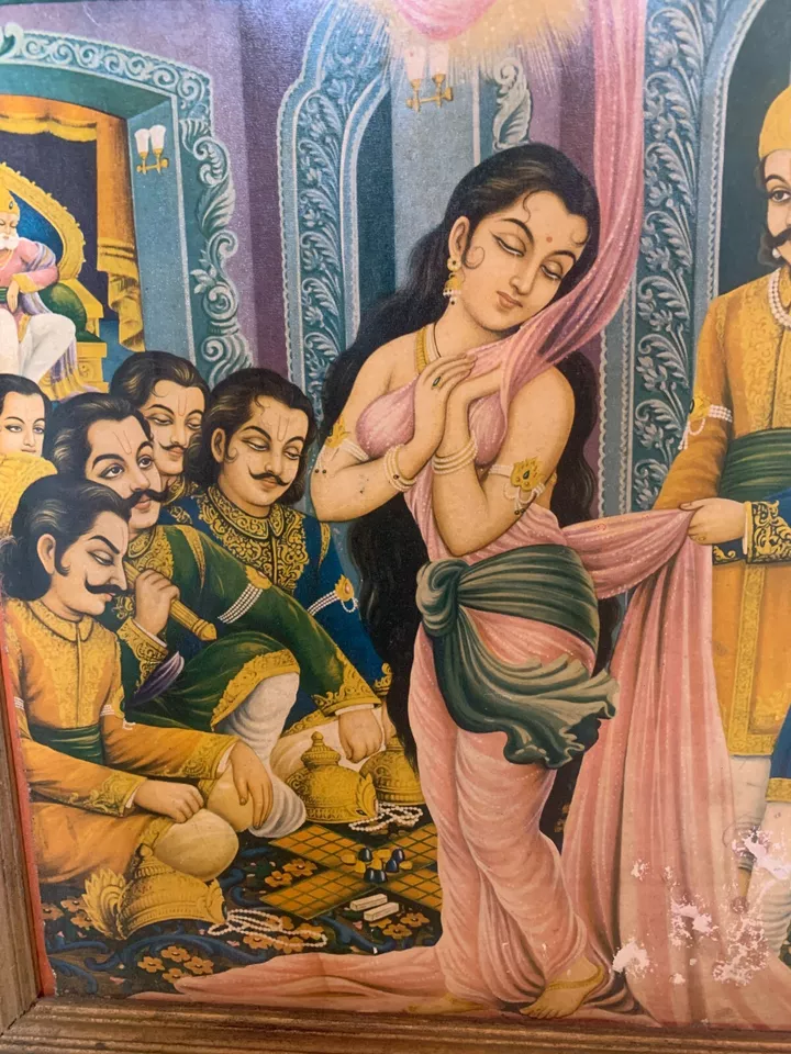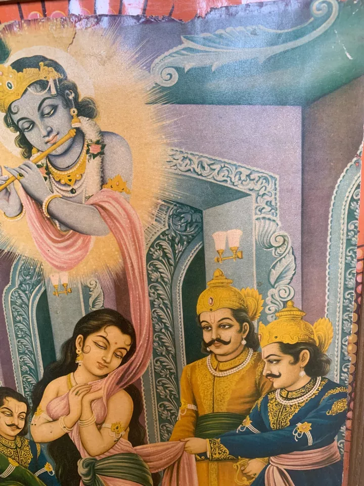 1900’s Vintage Draupdi Chirharan Hindu Religious Lithograph Print Wooden Framed