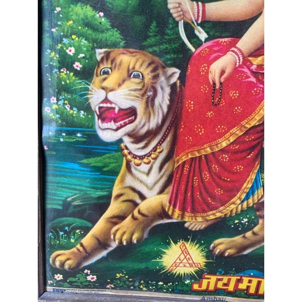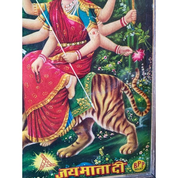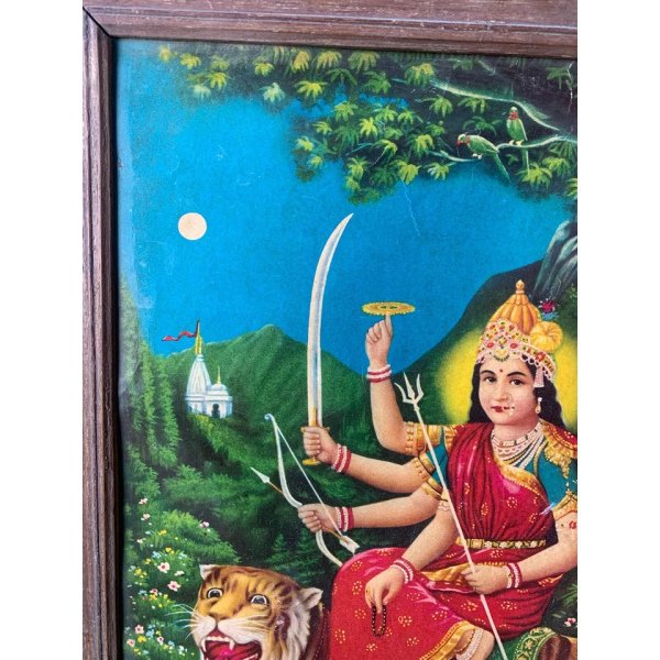 1970’s Old Rare Vintage Hindu Religious Goddess Durga Lithograph Print Framed