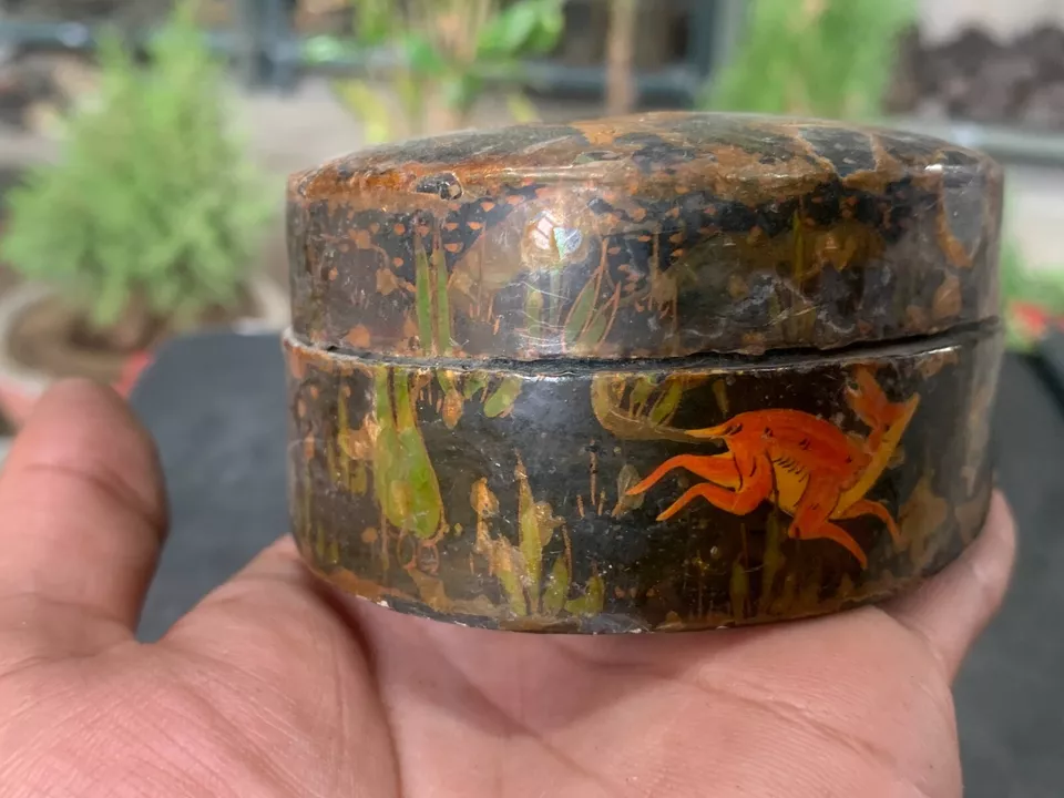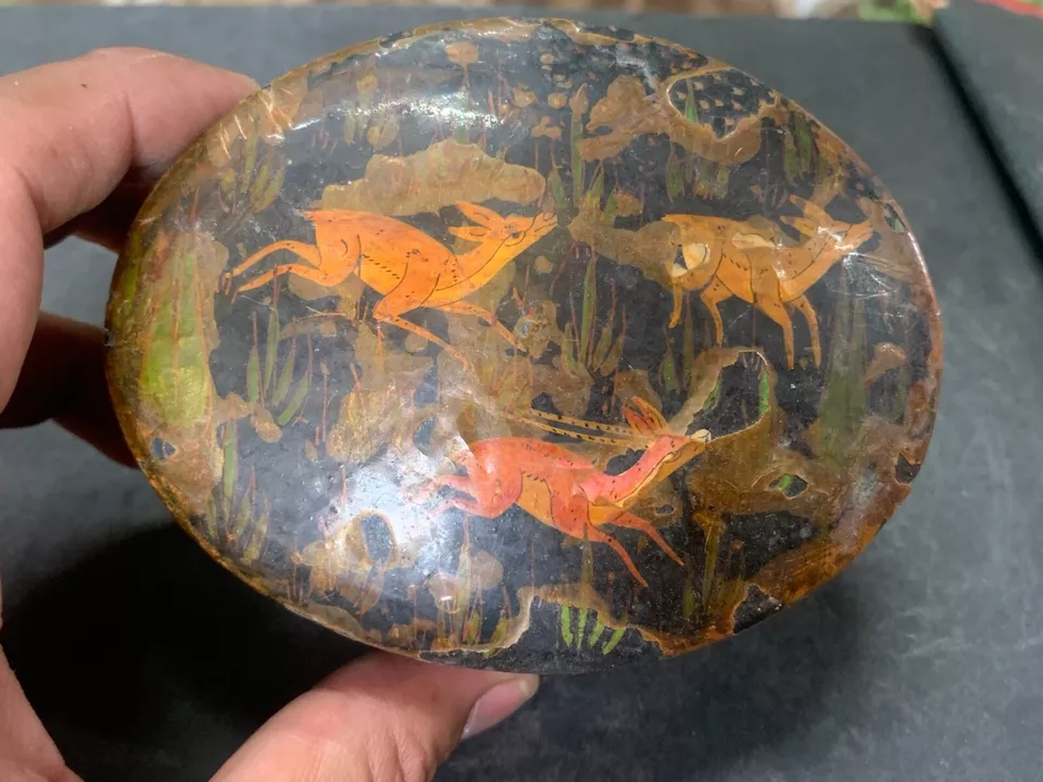 Antique Kashmiri Hand Crafted Wooden Tiger Hunting Deer Hand Painted Trinket Box