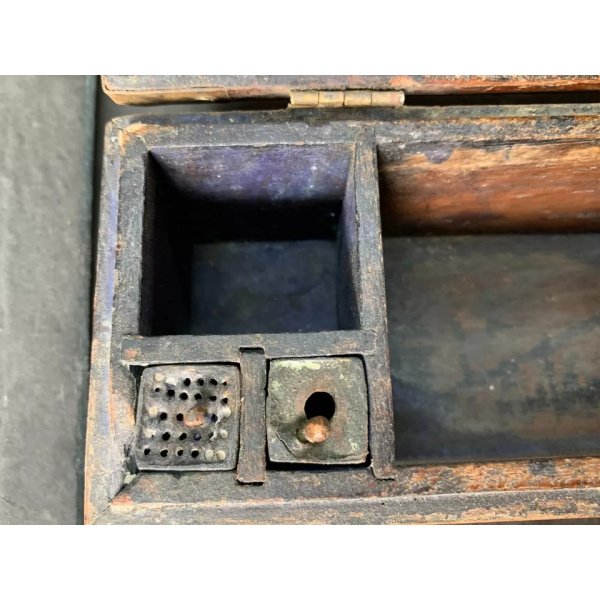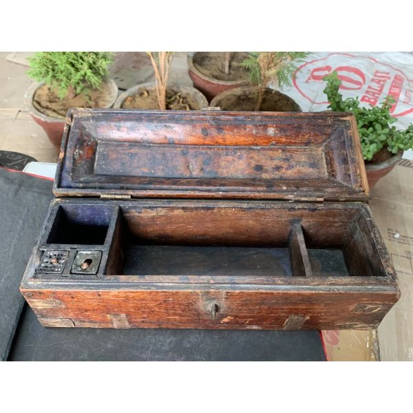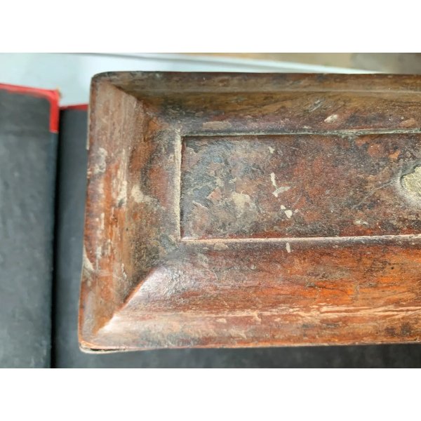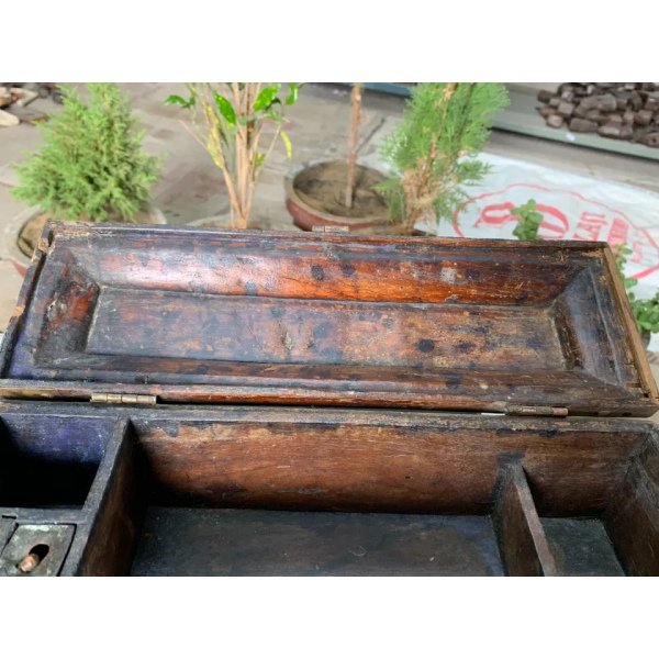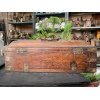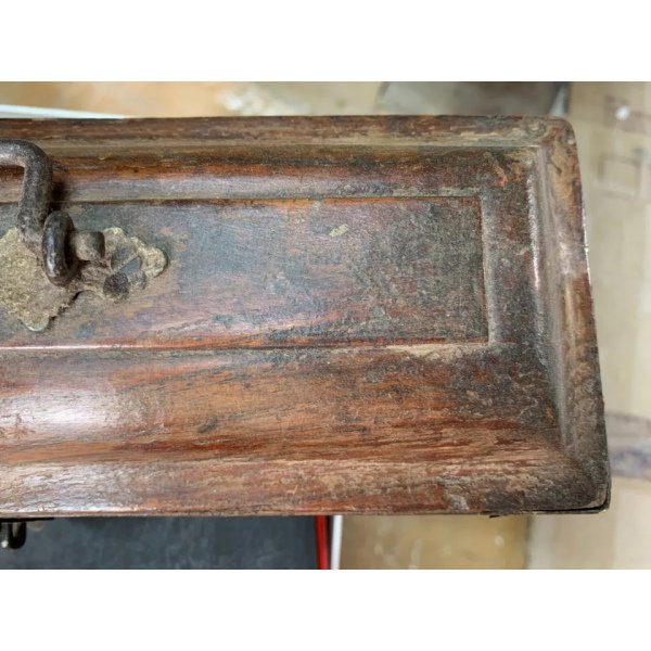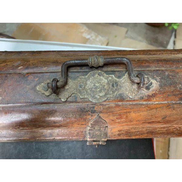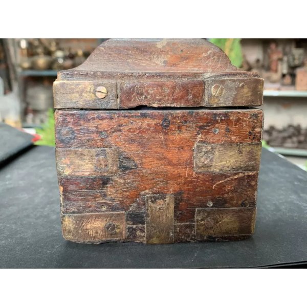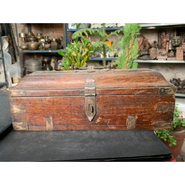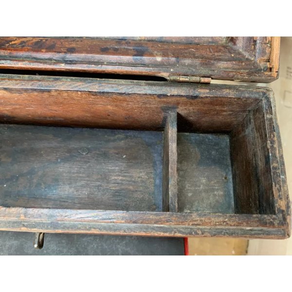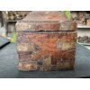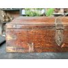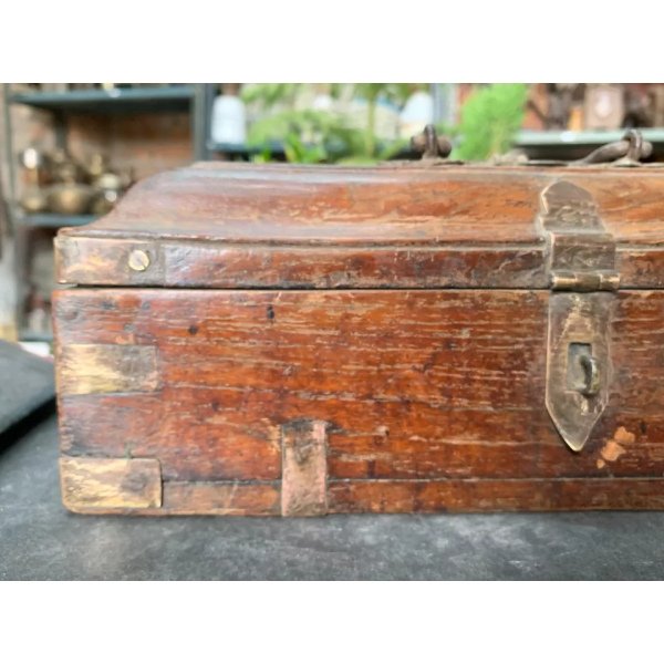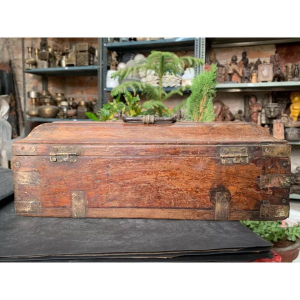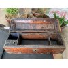 Antique Old Hand Carved Wooden Tool Chest Box With Brass Metal Latch & Handle