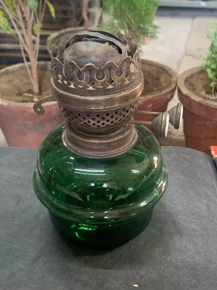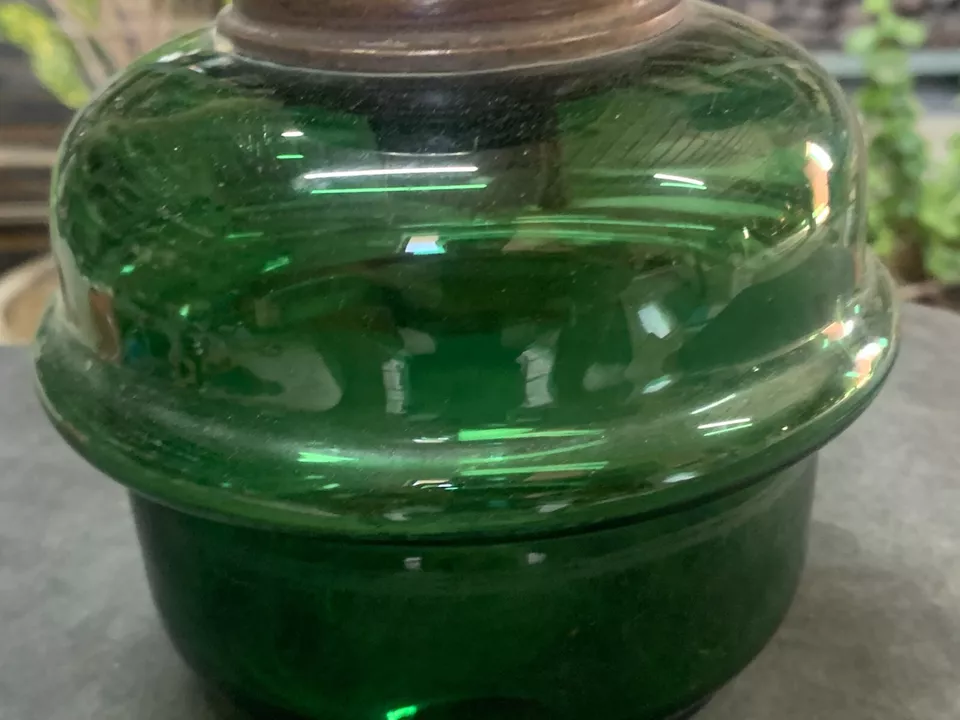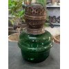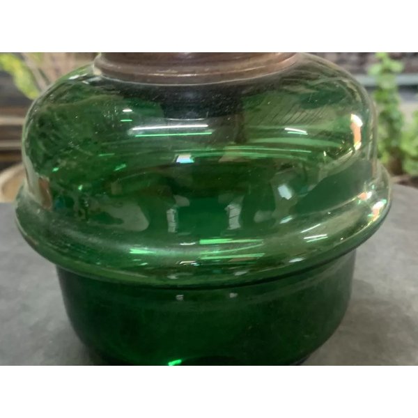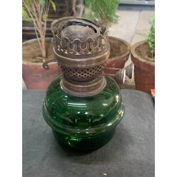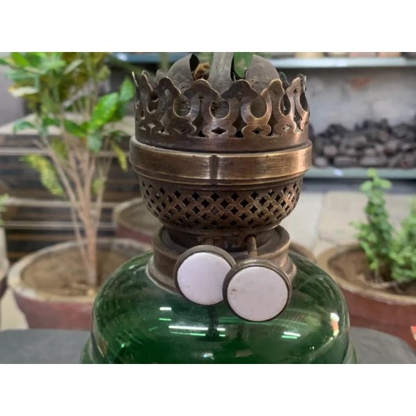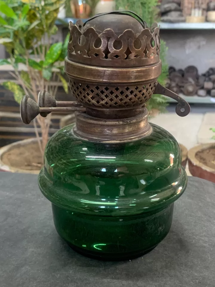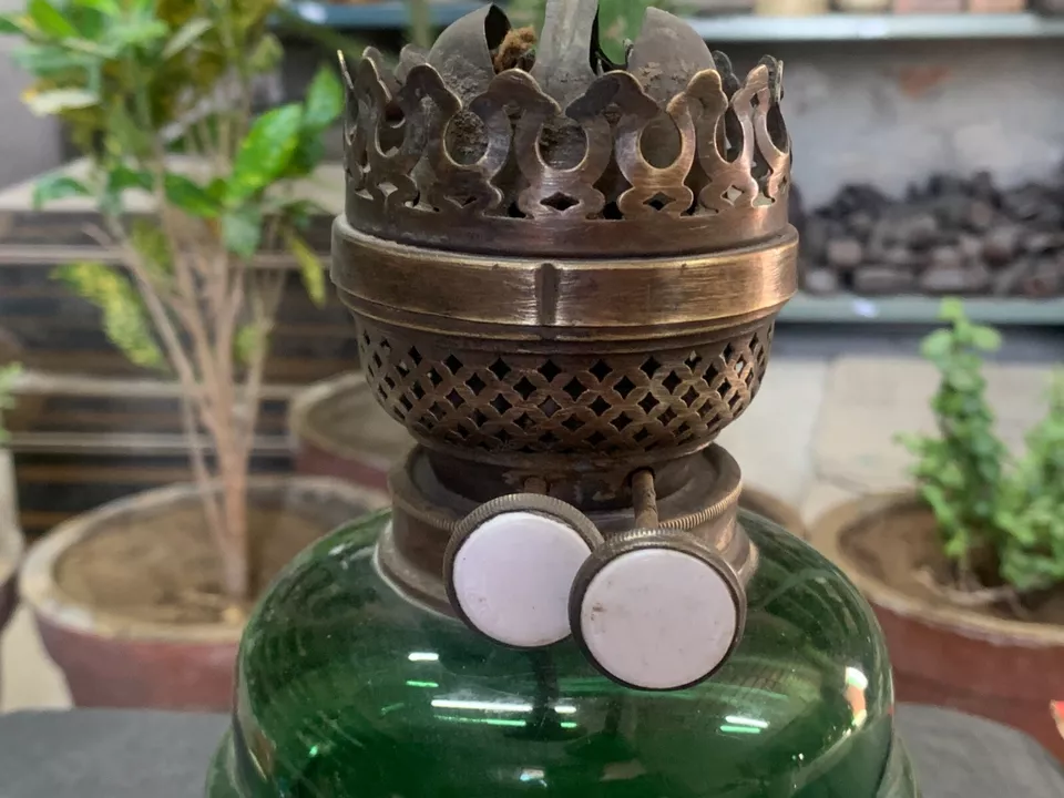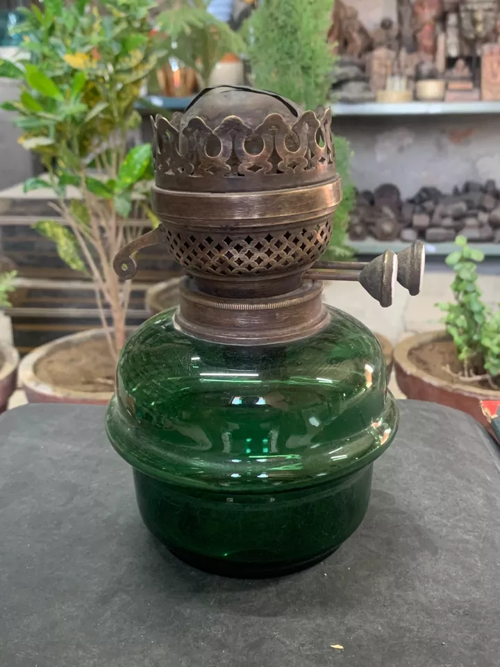 Vintage Rare Green Glass Base Oil Lamp Brass Metal Kerosene Lamp Made In India